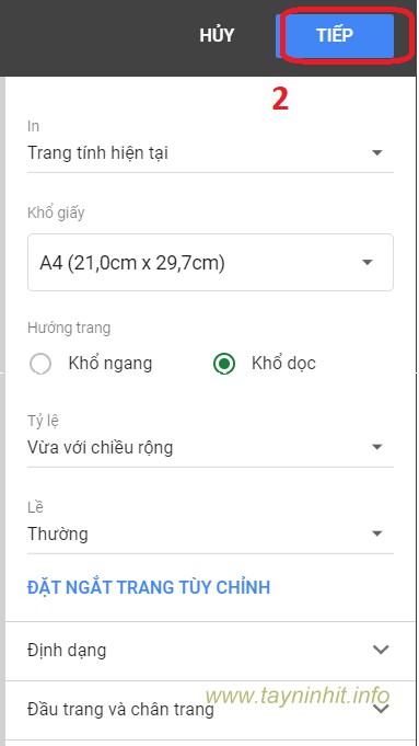 - Bước 2: Xuất hiện cửa sổ xem trước bản in chúng ta có thể tùy chọn các trang in hoặc khổ giấy in..., phía bên phải màn hình chọn Tiếp