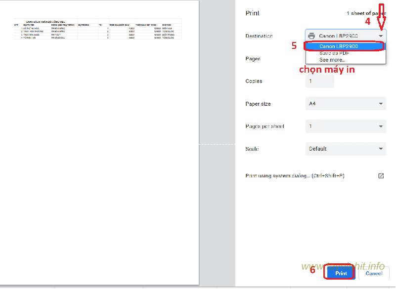 - Bước 4: Tiếp theo ở góc phải màn hình Chọn máy in => Print