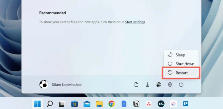 Trên menu Start, bạn có thể thấy một biểu tượng nguồn điện (thường là biểu tượng hình tròn màu trắng trên nền màu đen hoặc xanh). Nhấn vào biểu tượng này và sau đó nhấn chọn Restart.