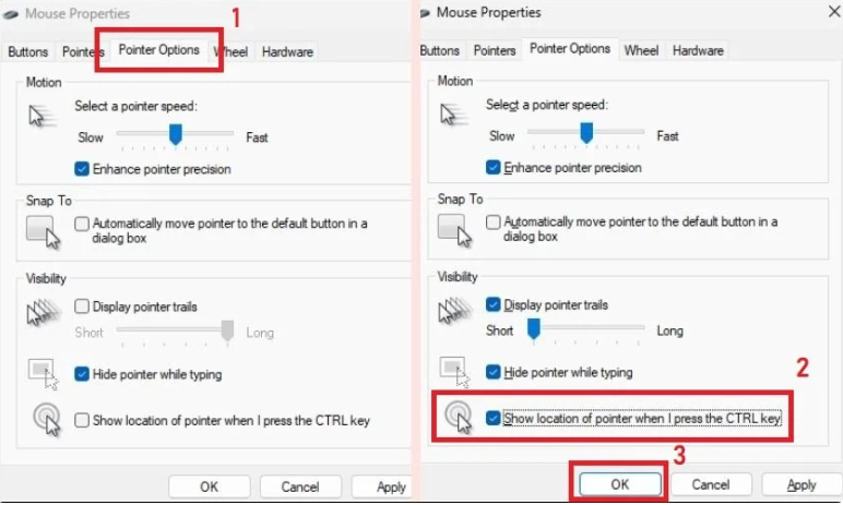- Bước 4: Cuối cùng, bạn chọn OK và Apply để thiết lập cài đặt và nhấn Ctrl. Như vậy là đã hoàn tất quá trình, từ nay mỗi khi bị mất con trỏ chuột trên màn hình laptop Win 11, bạn chỉ cần nhấn vào phím Ctrl.