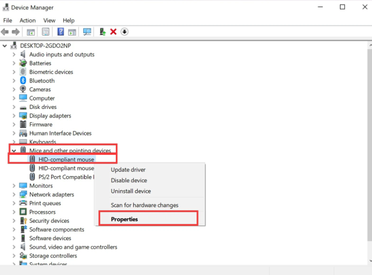 - Bước 3: Chọn thiết bị chuột mà bạn muốn khôi phục, nhấp chuột phải và chọn Properties.
