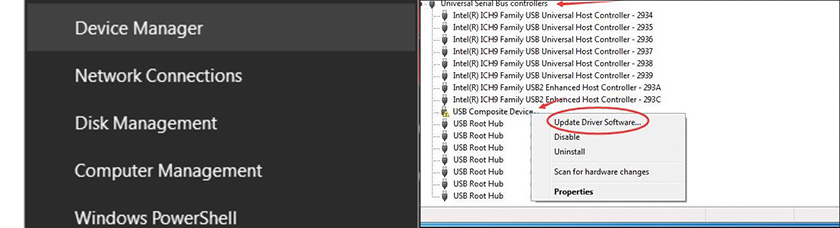 Để khắc phục lỗi này thì bạn có thể thực hiện như sau. Tại biểu tượng Windows ở góc dưới bên trái--> chọn mục Device Manager. Tiếp theo bạn kéo xuống và nhấn mở rộng mục Univer Serial Bus controllers, tại đây nếu có thiết bị USB nào có biểu tượng dấu chấm than thì bạn nhấn phải chuột và chọn mục Update Diver Software…, tiếp theo bạn bấm chọn mục Search automatically for updated diver software, chờ khi đã cập nhật xong thì bạn nhấn chọn cài diver USB.