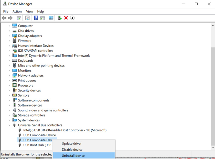 Đối với trường hợp không có thiết bị USB nào có biểu tượng dấu chấm than nhưng máy tính vẫn không nhận USB thì bạn có thể thử cài đặt lại diver. Tại mục USB Composite Device và USB Root Hub, bạn nhấn chuột phải và chọn mục Uninstall Device, sau đó nhấn chọn OK ở thông báo mới để xóa Diver.
