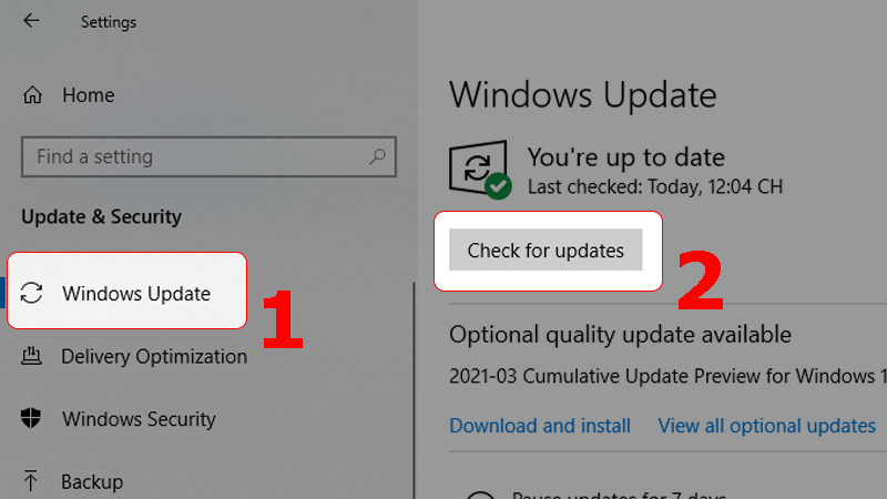 - Bước 2: Vào Windows Update > Chọn Check for update (Kiểm tra bản cập nhật).