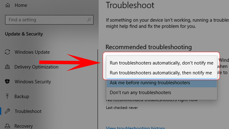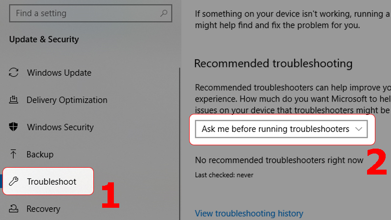 - Bước 2: Vào Troubleshoot > Chọn vào khung Ask me before running troubleshooters tại mục Recommended troubleshooting.
