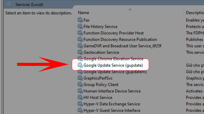 - Bước 2: Tại cửa sổ Services, bạn kéo xuống tìm và chọn mục Google Update Service.
