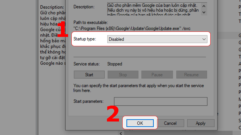 - Bước 3: Tại mục Startup type, hãy đổi thành Disabled > Nhấn chọn OK.