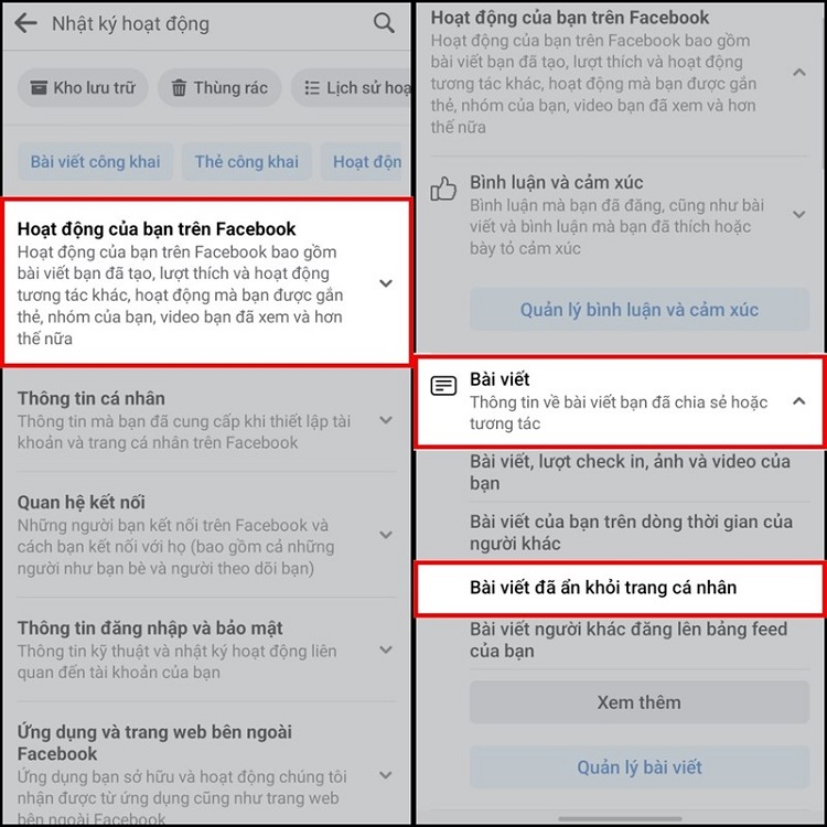 - Bước 2: Sau khi giao diện Nhật ký hoạt động được hiển thị > Chọn Hoạt động của bạn trên Facebook > Nhấn chọn vào mục Bài viết > Chọn Bài viết đã ẩn khỏi trang cá nhân.