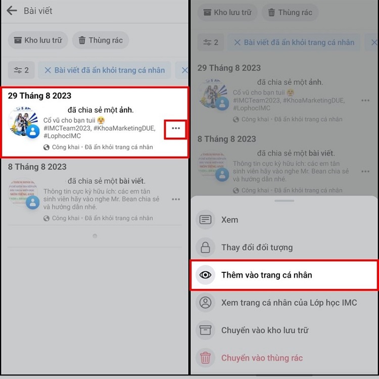 - Bước 4: Sau đó, những bài viết bị ẩn khỏi thời gian bạn lựa chọn sẽ hiển thị. Lúc này, bạn chọn vào biểu tượng ba chấm > Chọn Thêm vào trang cá nhân. Sau khi hoàn tất các bước trên, bài viết bị ẩn đã được khôi phục lại trên trang cá nhân của bạn rồi nhé.