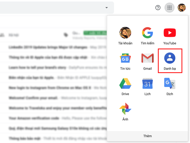Ứng dụng Danh bạ đã được Google gom lại vào khu vực chuyên dành cho ứng dụng ở góc trên bên phải của giao diện Gmail (bấm vào biểu tượng 9 chấm tròn cạnh ảnh đại diện) >> Chọn Danh bạ.
