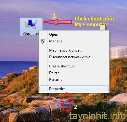 Với Windows 7 trở về trước, bạn cần vào Star --> click chuột phải vào My Computer hoặc click chuột phải vào biểu tượng My Computer ngay trên màn hình desktop --> chọn Properties.