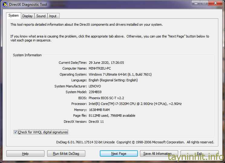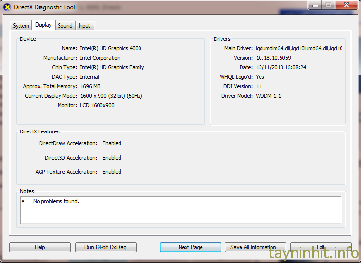 dxdiag sẽ hiển thị các thông tin tương tự như với Computer Properties, bên cạnh có còn có thông số về màn hình (trong phần Display), âm thanh – Sound và các thiết bị nhập liệu, hỗ trợ (trong phần Input, ở đây là chuột và bàn phím):