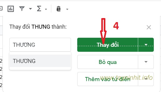 Nhấn Thay đổi để đổi sang từ viết đúng chính tả theo gợi ý của Google Sheets Excel