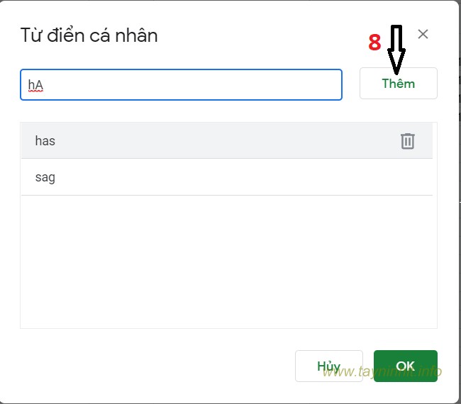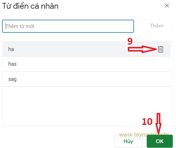 Nếu muốn xóa từ nào khỏi danh sách từ điển thì di chuột vào từ đó rồi nhấn vào biểu tượng thùng rác và bấm OK để xóa.