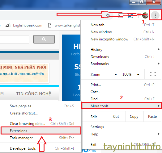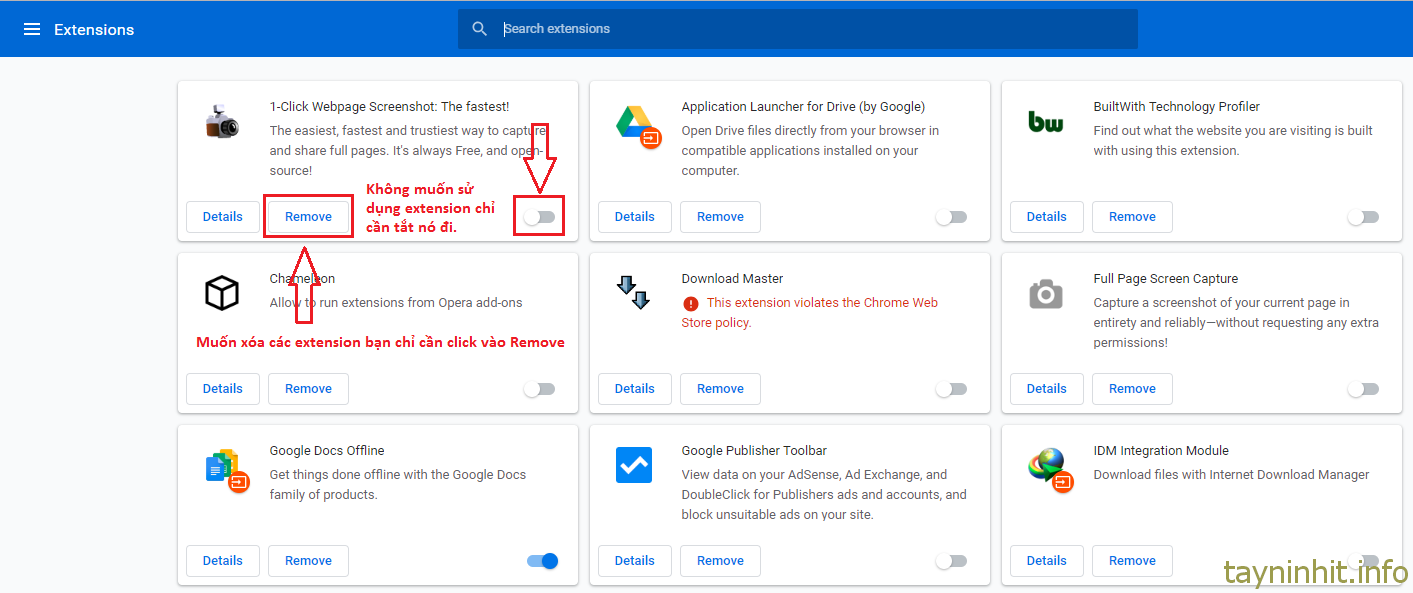 Hơn nữa, các extension cũng có thể là nguyên nhân khiến cho CPU tăng cao, hãy truy cập vào mục More Tools > Extensions để xem và tắt hoặc xóa bỏ các phần mở rộng không cần thiết.