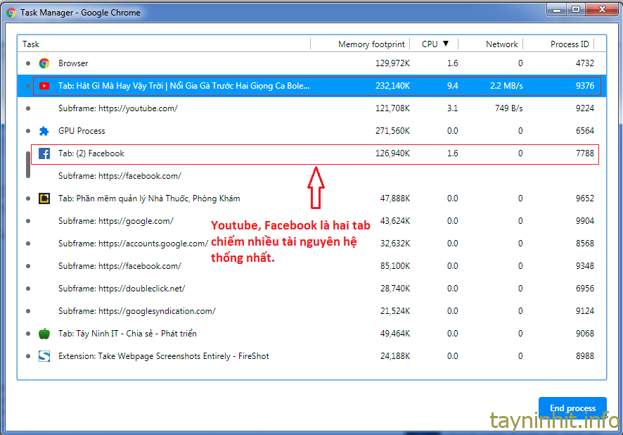 Tiếp tục, bạn hãy tiến hành kiểm tra xem website hay extension nào đang chiếm tài nguyên RAM và CPU. Ở đây bạn có thể thấy website Facebook và Youtube là hai website chiếm tài nguyên nhiều nhất. Bạn có thể ngừng và đóng tab đang chiếm dụng quá nhiều CPU hay Memory footprint bằng cách chọn --> click vào End Process.