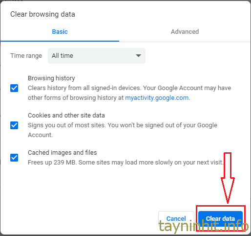 Ngoài ra bạn cũng có thể xóa các dữ liệu và bộ nhớ đệm trên trình duyệt Google chrome đế lấy lại không gian ổ cứng cho máy tính mình được thoải máy hơn bằng cách More tool --> "Clear browesing data..." --> Màn hình bên dưới sẽ hiện lên và click "Clear data".