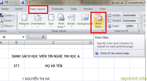 - Bước 1: Đầu tiên bạn mở file Excel với danh sách cần in lên. Tiếp đến ở tab Page Layout chọn Print Titles.
