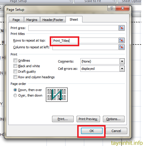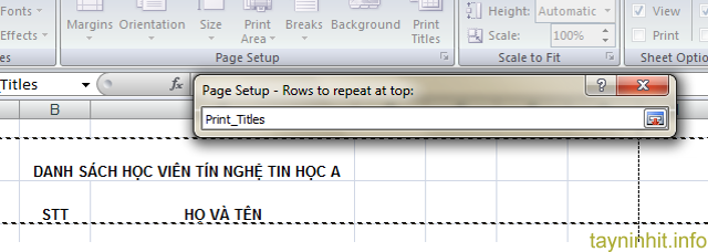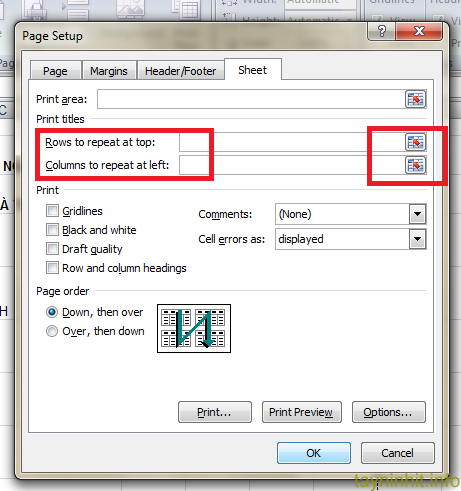 - Bước 2: Nếu muốn lặp lại tiêu đề theo dòng thì bạn chọn Rows to repeat at top. Nếu muốn lặp lại tiêu đề theo cột thì bạn chọn Colums to repeat at left.