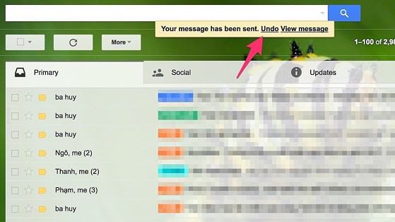 Kể từ lúc này, mỗi khi gửi email hoàn tất bạn sẽ thấy xuất hiện dòng thông báo Your message has been sent. Undo - View vessage, cho phép người dùng lấy lại email thông qua tùy chọn Undo.