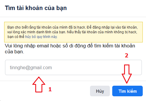 Tiếp theo bạn nhập thông tin như email hoặc số điện thoại mà bạn dùng để đăng ký tài khoản facebook đó, rồi nhấn Tìm kiếm.