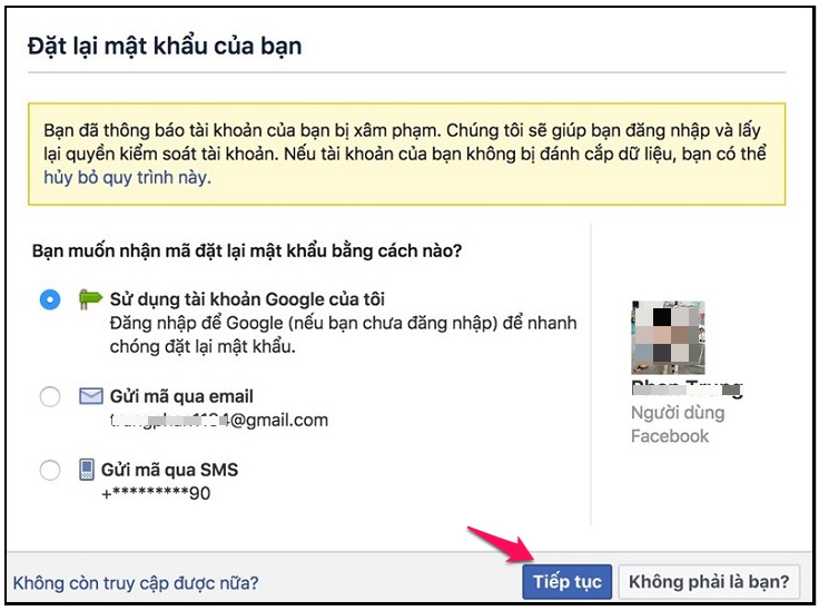 Lúc này bạn có thể chọn các phương thức lấy lại mật khẩu như bằng số điện thoại, email hoặc tài khoản Google mail rồi nhấn Tiếp tục.