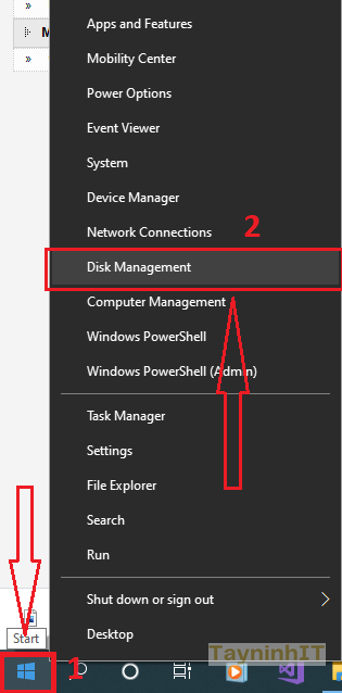 - Cách 2: Ở window10 các bạn có click chuột phải vào Start --> chọn "Disk Management"