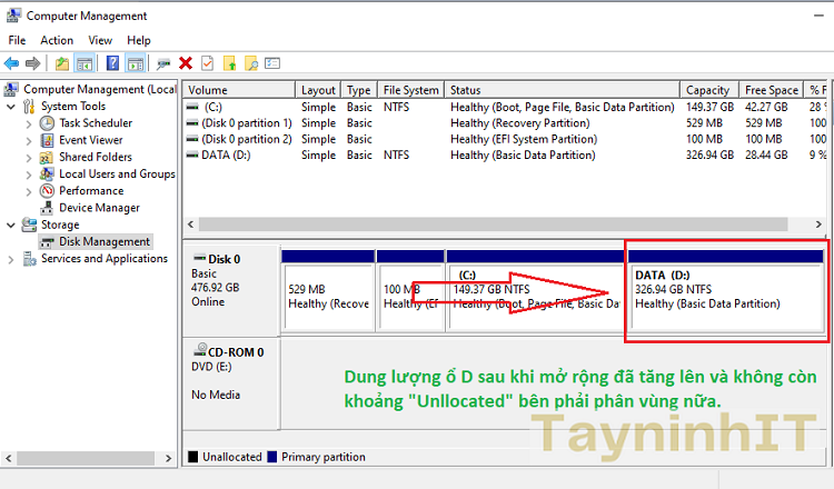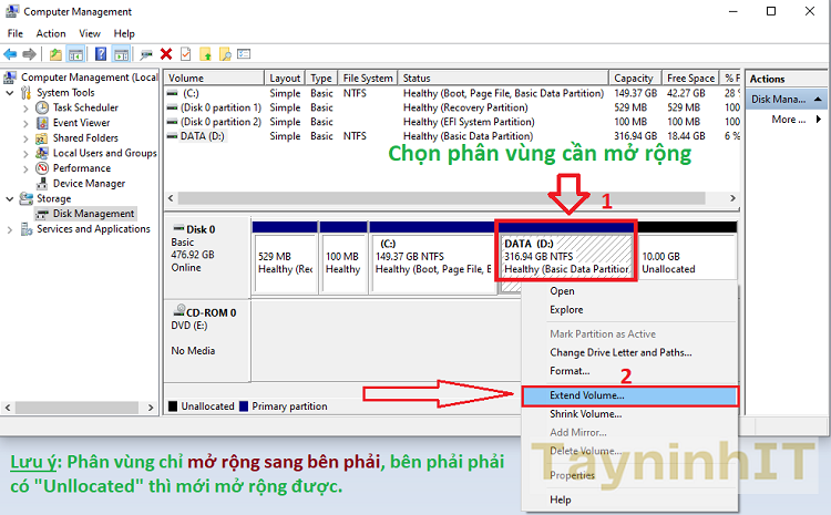 - Chỉ mở rộng được 2 phần vùng liền kề nhau: Ổ chính ở bên trái và ổ phụ (mở rộng) bên phải, Ổ phụ phải được xoá hết các dữ liệu và ở dạng Unallocated