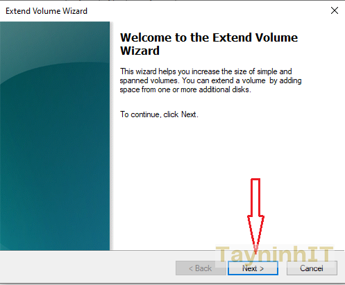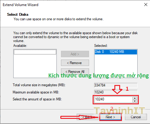 - Bước 2: Trong Extend Volume Wizard nếu bạn lấy hết phần "Unllocated" bên phải thì giữ nguyên các tham sối. Trường hợp bạn không muốn lấy hết dung lượng còn trống thì bạn nhập dung lượng mong muốn vào ô "Select the amount of space in MB". Tiếp đó nhân "Next" để tiệp tục