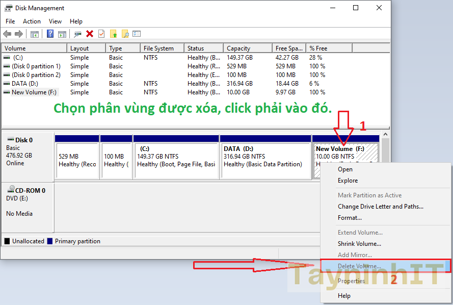- Bước 1: Trước tiên, chúng ta cần xoá phân vùng của của phụ. Tại giao diện của Disk Management, tiến hành xoá phân vùng phụ đi bằng cách chọn click chuột phải vào phân vùng --> chọn Delete Volume.
