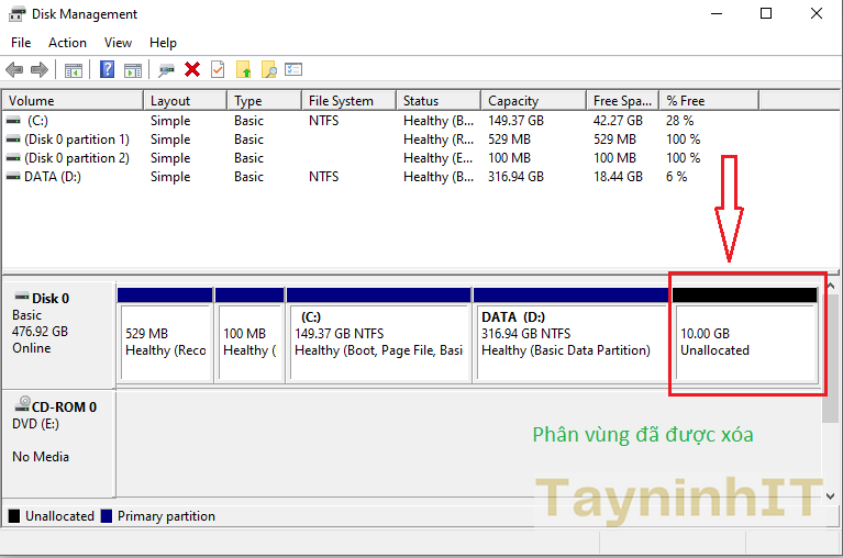Khi Delete Volume, toàn bộ dữ liệu của phần vùng này sẽ bị xoá vì vậy mà bạn nên sao lưu lại những thứ cần thiết trước khi thực hiện. Kết quả sau khi xóa phân vùng, chúng ta được phân vùn trống "Unllocated"