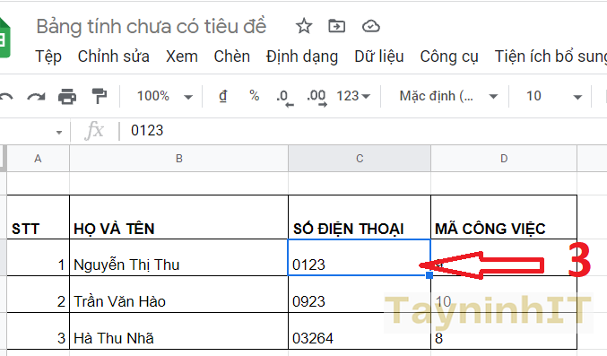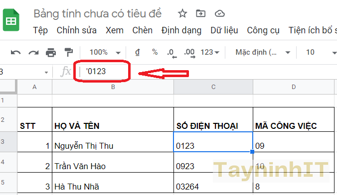 Đây là cách nhanh nhất để người dùng có thể nhập số 0 trong Google Sheets mà không biến mất khi đứng đầu trước dãy số. Bạn chỉ cần nhấn dấu ' ở đằng trước dãy số rồi nhập dãy số hoàn chỉnh có số 0 như hình dưới đây.