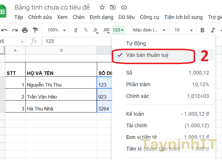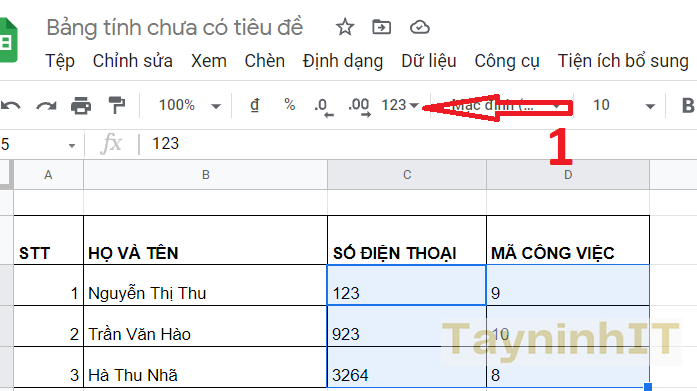 - Bước 1: Đầu tiên bạn chọn những ô muốn nhập dãy số với số 0 đằng trước, rồi nhấn vào biểu tượng 123 ở trên thanh công cụ.