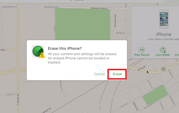 - Bước 3: Bạn chọn Erase iPhone để xóa toàn bộ dữ liệu trên iPhone. Sau đó ấn Erase để xác nhận. Sau đó bạn chỉ cần chờ đợi, và thay đổi mật khẩu mới khi hoàn tất.