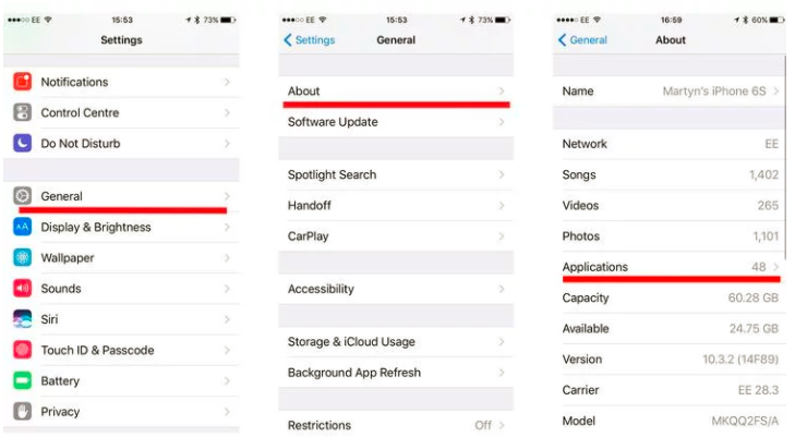 Apple đã phát hành một công cụ giúp bạn kiểm tra xem ứng dụng nào sẽ không hoạt động với iOS 11. Trên Iphone hoặc Ipad, bạn hãy vào Cài đặt -> Chung -> Giới thiệu -> Ứng dụng (Settings -> General -> About -> Applications ) trên iPhone của mình, nhìn danh sách bên dưới: