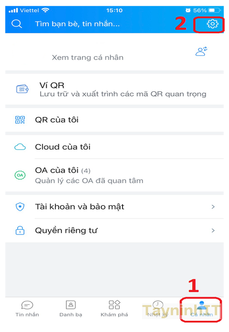 - Bước 1: Mở ứng dụng Zalo > Chọn Cá nhân > Chọn Cài đặt như hình.