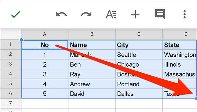 - Bước 2: Sau đó, dùng đầu ngón tay kéo từ góc trên bên trái đến góc dưới cùng bên phải của bảng để “bôi đen” bảng tính.