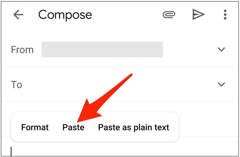 - Bước 5: Trên màn hình soạn email mới, nhấn và giữ vào một vị trí trong mục “Compose Email” > “Paste”.