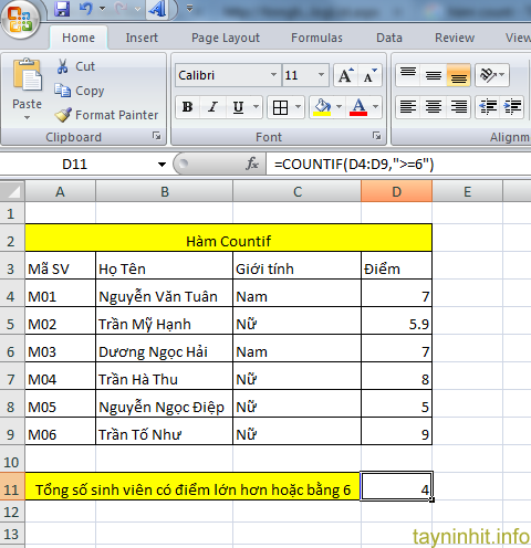 Ví dụ: sau đây là ví dụ sử dụng hàm Countif để đếm số lượng sinh viên có điểm lớn hơn hoặc bằng 6.
