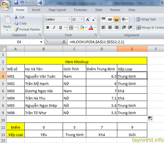 Công thức ở Ô E4: =HLOOKUP(D4,$A$11:$E$12,2,1)