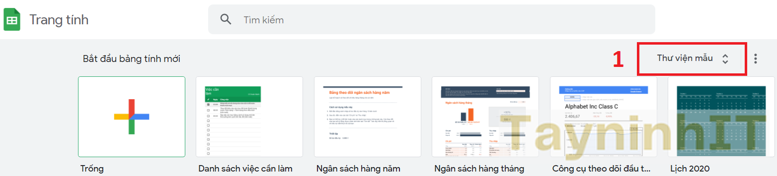 - Bước 1: Tại giao diện trên Google Sheets Excel bạn nhìn sang bên phải nhấn vào Thư viện mẫu để mở các mẫu có sẵn trên Google Sheets.
