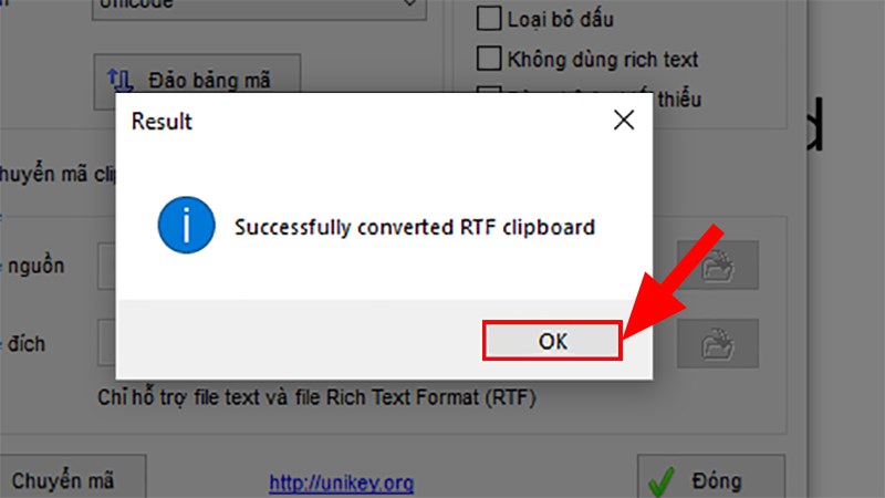 - Bước 5: Unikey sẽ hiện thông báo đã chuyển đổi thành công > Nhấn OK để hoàn tất chuyển đổi.
