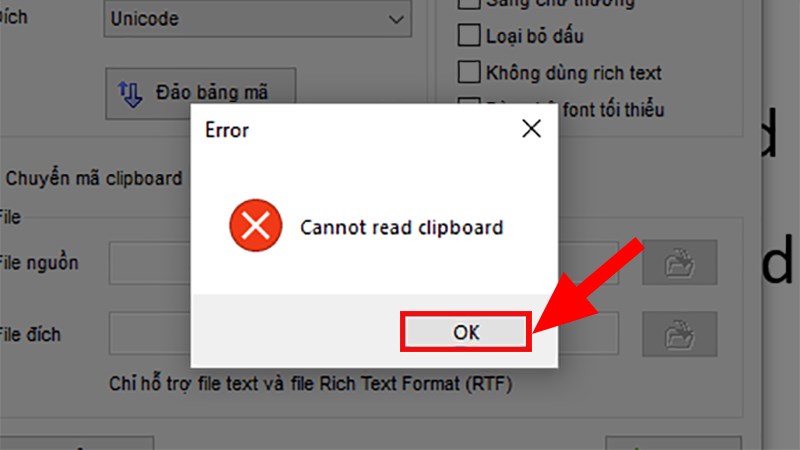 Lưu ý: Nếu xuất hiện thông báo lỗi "Cannot read clipboard" thì là do bạn chưa copy thành công đoạn văn bản. Ở đây bạn chỉ cần thực hiện lại các bước từ đầu thôi nhé.