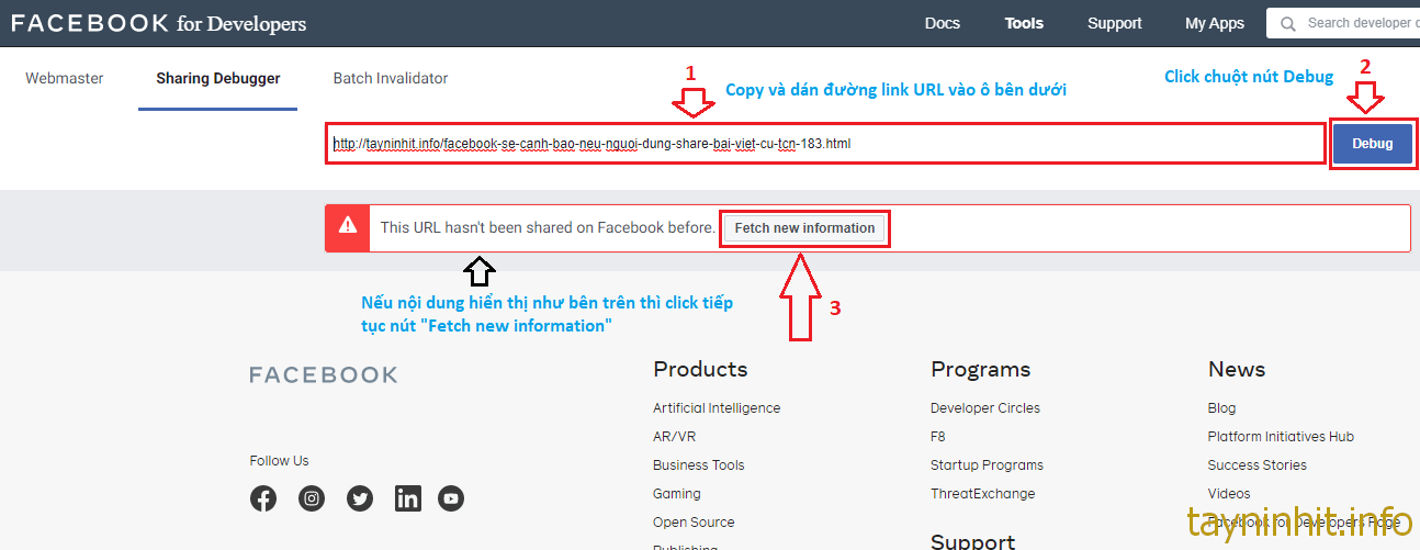 developers.facebook.com/tools/debug, sau đó sao chép và dán địa chỉ URL liên kết vào mục trạng thái trên Facebook và nhấn nút "