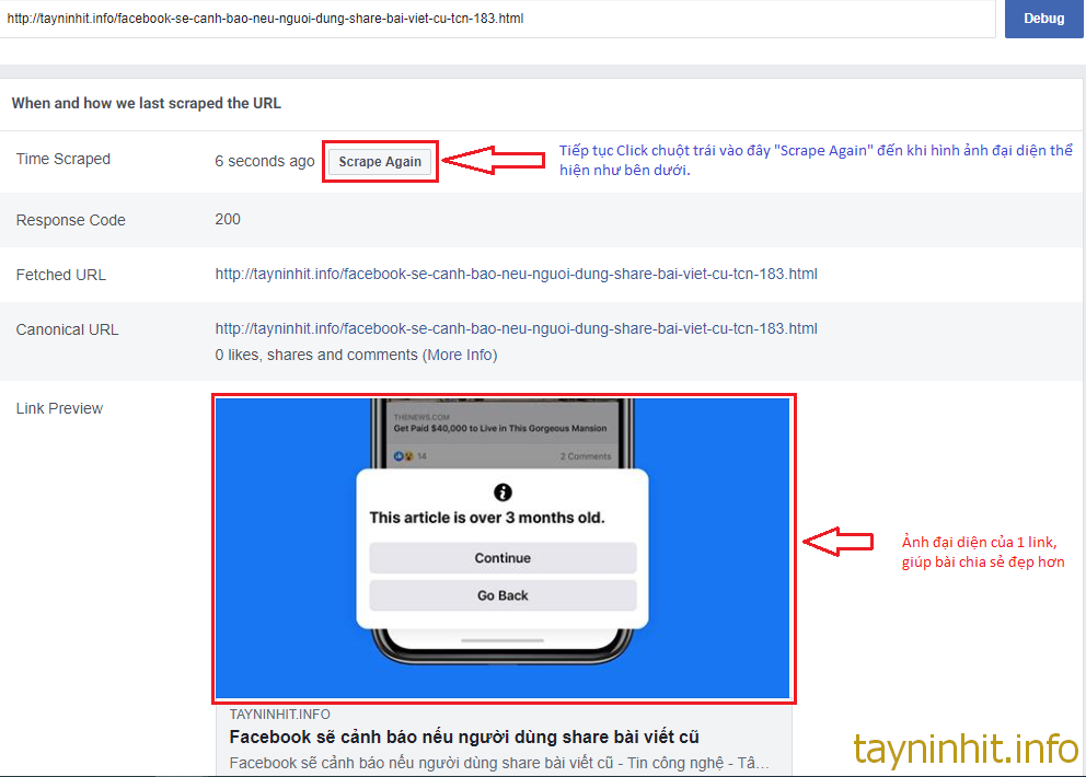 - Bước 3: Thông thường ở các đường link URL đã đăng lâu thì khi thực hiện bước 2 xong thì bạn sẽ nhận được link đầy đủ có cả hỉnh ảnh đại diện ở bên dưới, tuy nhiên nếu là đường link URL mới thì facebook vẫn chưa xử llý được và khi đó bạn chỉ cần nhấn nút "Scrap Again"