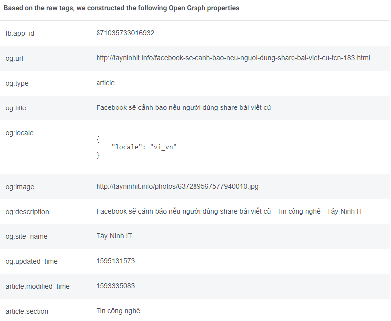 Sau khi click vào đường link trên, màn hình sẽ hiện ra cửa sổ bao gồm các tên miền website, tiêu đề, mô tả ngắn gọn và hình ảnh đại diện của link URL bạn muốn chia sẻ. Bạn hãy cuộn xuống dưới để xem tiếp các thông tin và thẻ meta khác của URL này được facebook nhìn thấy