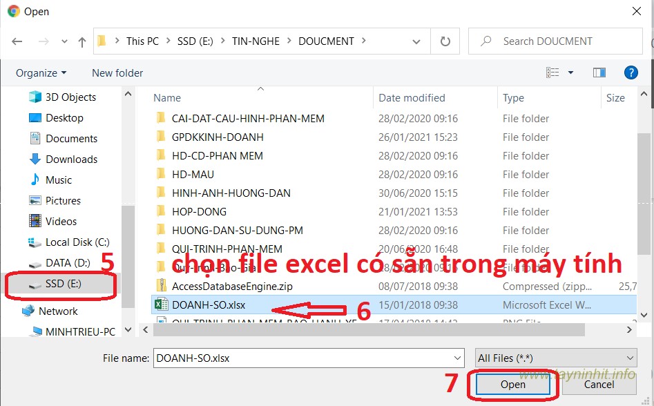 - Bước 3: Chọn file Excel cần đưa lên => Open