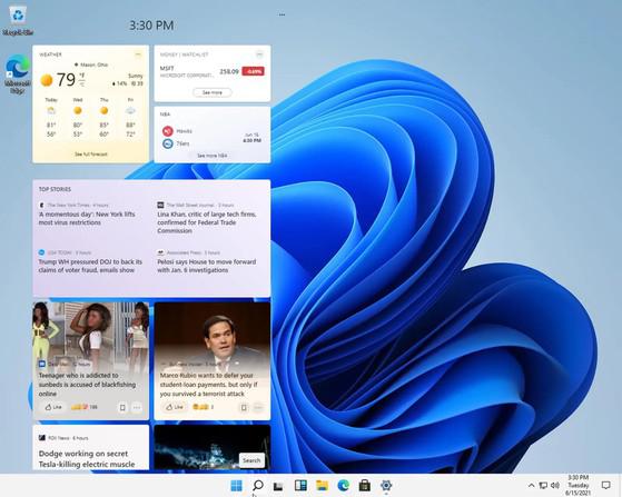 Ảnh chụp màn hình cho thấy giao diện người dùng trên Windows 11 đã được “tân trang” lại, các ứng dụng trên Taskbar (thanh tác vụ) được đặt ở chính giữa, vị trí của Live Tiles trong menu Start đã được thay thế bằng những tệp tin được mở gần đây, danh sách các ứng dụng, cho phép người dùng truy cập dễ dàng hơn.