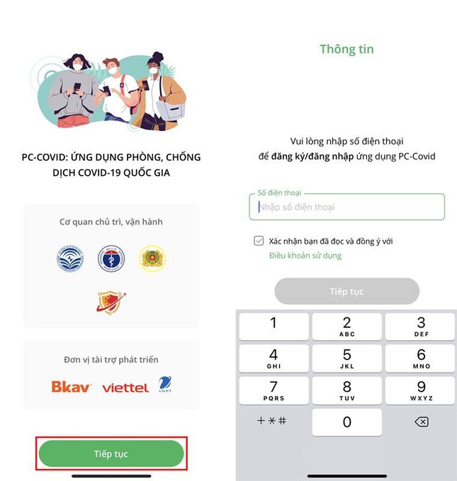- Bước 2: Mở ứng dụng, bạn sẽ được giới thiệu về ứng dụng, nhấn Tiếp tục > nhập số điện thoại vào để đăng ký hoặc đăng nhập ứng dụng PC Covid nếu đã có tài khoản