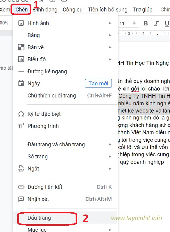 Trên thanh công cụ chọn > Chèn > Dấu trang